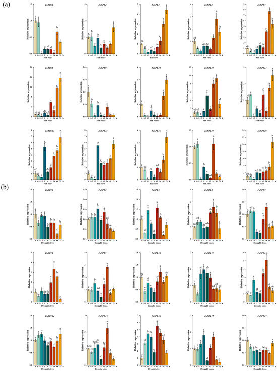 To study how EoSPL genes are expressed under various abiotic stress situations, the expression levels of 15 EoSPLs across five experimental conditions were quantified using qRT-PCR (Figure 11). Under the salt treatment, the expression patterns of the majority of the EoSPL genes displayed an upward trend as processing time increased (Figure 11a). Among them, EoSPL2, EoSPL3, EoSPL8, EoSPL10, EoSPL13, EoSPL14, EoSPL16, and EoSPL19 exhibited higher expression levels at 72 h under salt stress conditions. Conversely, the relative expression levels of EoSPL5, EoSPL7, and EoSPL11 were higher at 48 h but decreased with the increase in salt stress time. The results indicated that EoSPL genes responded positively to salt stress. Moreover, the expression levels of EoSPL1 and EoSPL9 were reduced at each time point compared to the control conditions under salt stress.