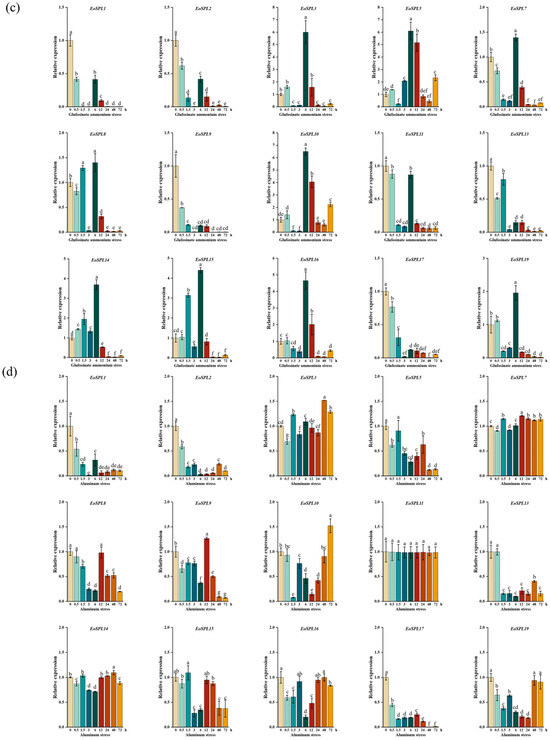 Under glufosinate ammonium stress, the expression levels for EoSPL1, EoSPL2, EoSPL9, EoSPL11, EoSPL13, and EoSPL17 were reduced when compared to the control, and the expression levels for the other genes were the highest at 6 h of treatment (Figure 11c). Additionally, the expression levels for EoSPL1, EoSPL2, EoSPL5, EoSPL8, EoSPL13, EoSPL17, and EoSPL19 were lower in comparison to the control under aluminum stress. The expression levels for EoSPL3, EoSPL9, and EoSPL10 were higher at 48 h, 12 h, and 72 h under aluminum stress, respectively, whereas the other genes exhibited minimal changes (Figure 11d).