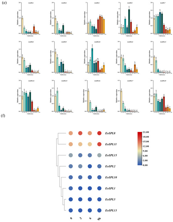 The expression levels of EoSPL3, EoSPL5, EoSPL7, and EoSPL10 were determined following cold stress, with EoSPL3 reaching its peak expression at 24 h, EoSPL5 at 6 h, EoSPL7 at 3 h, and EoSPL10 at 1.5 h (Figure 11e). Moreover, the expression of EoSPL14 and EoSPL19 decreased with the increase in cold stress time. To further investigate the functions of EoSPL genes in coping with cold stress, the expression profiles of selected genes were examined utilizing RNA-seq data obtained from experiments conducted at low temperatures. The expression patterns of eight EoSPLs under cold stress were visualized in a heatmap (Figure 11f). The expression patterns of EoSPL1 were consistently lower than the control across all time points. The expression levels of EoSPL2 and EoSPL10 reached their peak at 3 h, after which they progressively decreased. The expression patterns of EoSPL5, EoSPL11, EoSPL13, and EoSPL15 exhibited a trend of initial decrease followed by an increase. The expression pattern of EoSPL8 demonstrated an initial rise, a subsequent decrease, and a final increase. The results were generally consistent with our qRT-PCR results and confirmed the reliability of the qRT-PCR results.