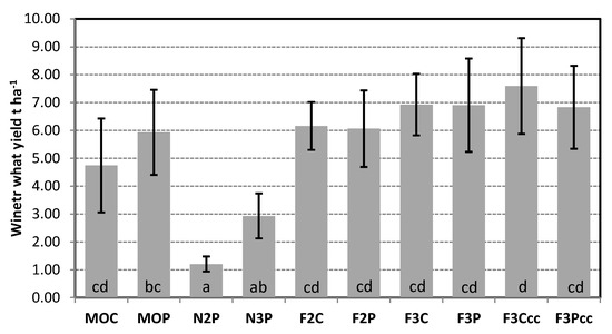 Winter wheat yield (t ha−1) at the experimental field (2020–2023) MOC: WW monoculture CT; MOP: WW monoculture PT; N2P: unfertilized WW PT; N3P: unfertilized WW PT; F2C: fertilized 2-year WW CT; F2P: fertilized 2-year WW PT; F3C: fertilized 3-year WW CT; F3P: fertilized 3-year WW PT; F3Ccc: fertilized 3-year WW cover crop CT; F3Pcc: fertilized 3-year WW cover crop PT. Histogram bars marked with the same letter do not differ significantly at p < 0.05.
