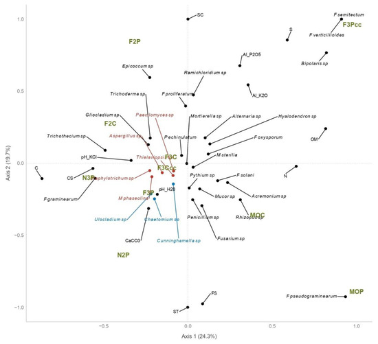 The soil fungi with the closest and most positive relationship to pH were Ulocladium sp., Chaetomium sp., Chunninghamella sp., M. phaseolina, Thielaviopsis sp., Paecilomyces sp., Aspergillus sp., and Staphylotrichum sp. (Cluster 1—Red color in Figure 2). The species Ulocladium sp, Chaetomium sp., and Chunninghamella sp. had the most positive relationship to CaCO3 (Cluster 2—Blue color in Figure 2) as well. F. graminearum, Trichothecium sp. and Staphylotrichum sp. correlated positively with coarse sand (CS). Bipolaris sp., F. verticillioides and F. semitectum showed preferences for soil conditions found in the F2Pcc. Fusarium pseudograminearum was found only in MOP.