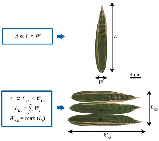 The Montgomery equation (ME) and the Montgomery–Koyama–Smith equation (MKSE) illustrated by leaves of a Sasaella kongosanensis ‘Aureostriatus’ shoot. The ME assumes that individual leaf area (A) is proportional to the product of individual leaf length (L) and width (W); the MKSE assumes that the total leaf area per shoot (AT) is proportional to the product of the sum of leaf widths per shoot (LKS) and the maximum leaf length per shoot (WKS). There are three leaves in the shoot example, i.e., n = 3.