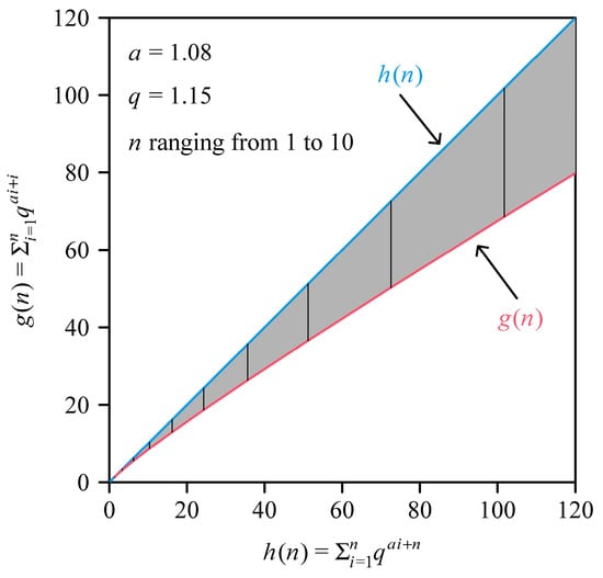 Equation (10) suggests that is determined by q and n, irrespective of the smallest leaf length per shoot (i.e., L1). If the common ratio of the leaf length sequence (q) and the number of leaves per shoot (n) are both constant across different shoots, is a constant that is smaller than unity according to Equation (10). In that case, is also a constant that is smaller than unity considering k < 1 (see Equation (1)). Given that there is usually a very small variation in q across shoots, let us assume q is a constant in Equation (10) for all shoots of the same species. Then , which is apparently a decreasing function of n given i ≤ n in Equation (10). Let and . Since and are both increasing functions of n, and is a decreasing function of n, it means that increases in do not keep pace with increases in (supposing is plotted against ; Figure 2). This means that the scaling exponent of vs. should be smaller than unity. Because and , the numerical value of α in Equation (3) should be also smaller than unity under the condition that n varies across different shoots. In the above proofs, the numerical value of a does not affect the above derivations. Yan et al. [29] gave similar derivations when a = 1 (see their Discussion section and Figure 9 therein), i.e., the proofs for a special case of the present study with a = 1. The present study relaxes the limit that leaf (stomatal) width should be proportional to leaf (stomatal) length for rendering the MKSE to hold true, which was set in [5,29]. The present study predicts an allometric relationship between and due to the variation in n across different shoots.