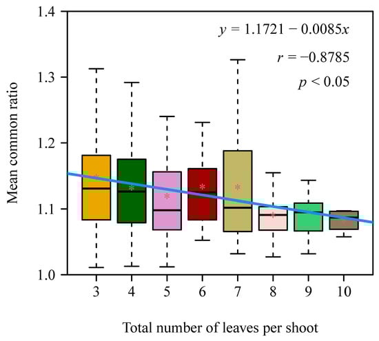 Comparison of the mean common ratios among the eight Sasaella kongosanensis ‘Aureostriatus’ shoot groups, and the correlation between the mean of the mean common ratios for each shoot group (y) and the number of leaves per shoot (x). Here, the horizontal solid lines in each box represent the medians; the asterisks near the medians represent the means; the whiskers extend to the most extreme data point, which is no more than 1.5 times the interquartile range from the box; the blue straight line is the regression line for the mean of the mean common ratios of each shoot group vs. the number of leaves per shoot. The p-value is for Pearson’s product moment correlation coefficient between x and y.
