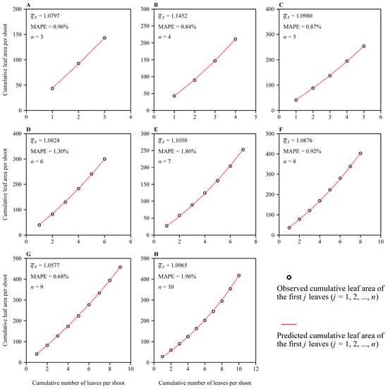 Fitted results of the geometric series to the observed cumulative leaf area sequences of eight shoot examples corresponding to the eight Sasaella kongosanensis ‘Aureostriatus’ shoot groups ranging from 3 to 10 (see Table 1 for details). Panels (A–H) represent different shoot groups. In each panel, represents the mean common ratio of the leaf area geometric series for each shoot; MAPE is the mean absolute percentage error between the observed and predicted cumulative leaf area sequences for each shoot; n is the number of leaves for each shoot.
