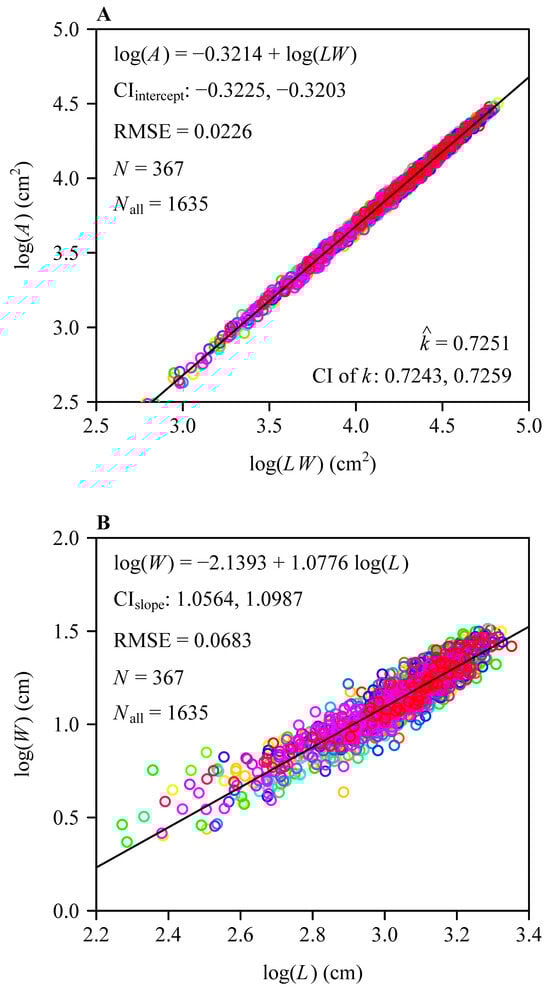 where log(A) was regarded as the response variable, log(LW) was regarded as the predictor variable, and log(k) was regarded as the intercept.