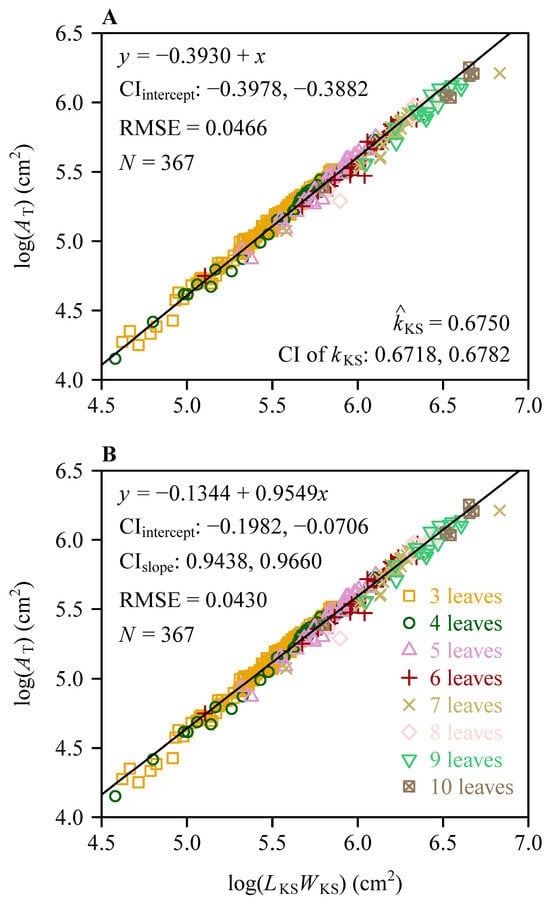 Results of fitting the Montgomery–Koyama–Smith equation (A) and the power law equation (B) between the total leaf area per shoot (AT) and the product of the sum of leaf widths and the maximum leaf length per shoot (LKSWKS) on a log-log scale for the eight Sasaella kongosanensis ‘Aureostriatus’ shoot groups with 3 to 10 leaves per shoot. Different symbols are the observations of different shoot groups converted on a log-log scale; CIintercept is the 95% confidence interval of the intercept; CIslope is the 95% confidence interval of the slope; RMSE is the root-mean-square error of the linear fitting; and N is the total number of shoots of the eight shoot groups. In panel (A), KS represents the estimated value of the proportionality coefficient of the MKSE, and CI of represents the 95% confidence interval of the proportionality coefficient of the MKSE.