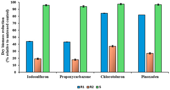 Based on the dry weight of surviving plants, pyroxsulam-resistant biotypes were highly resistant against other groups of ALS-inhibiting herbicides. We found that both R1 and R2 biotypes were resistant to iodosulfuron, with an average dry biomass reduction of 44.15% and 19.23%, respectively, and to propoxycarbazone, with an average dry biomass reduction of 43.29% and 17.945%, respectively. In contrast, the S biotype showed an average dry biomass reduction of 95.72% and 94.01%, respectively, after treatment with each herbicide (Figure 1 and Figure S2). Propoxycarbazone belongs to the triazolopyrimidine group, whereas iodosulfuron belongs to the sulfonylurea group. Similarly, both R1 and R2 biotypes were resistant against pinoxaden, with an average dry biomass reduction of 81.81% and 26.92%, respectively. At the same time, the S biotype showed an average dry biomass reduction of 96.58%. The R2 biotype was also found to be resistant to the PSII-inhibiting herbicide chlortoluron, with an average dry biomass reduction of 37.17% (Figure 1 and Figure S2).
