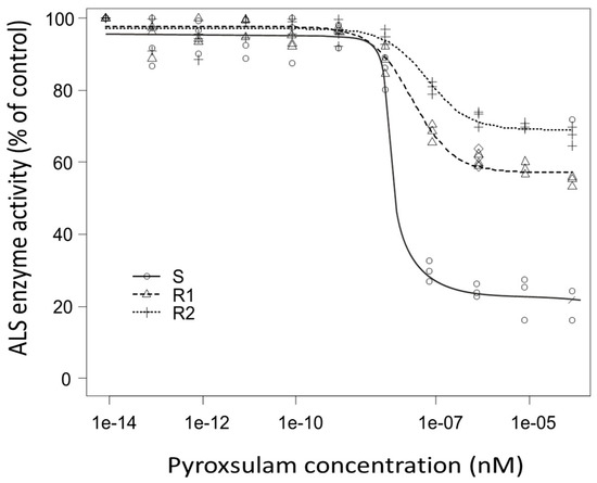 For a further confirmation of resistance, ALS enzyme activity was compared between S and R biotypes. In the absence of pyroxsulam, no differences in ALS activity were observed among the tested biotypes. However, upon the addition of pyroxsulam, the ALS protein activity of the R biotypes was higher compared to that of the S biotype (Figure 2). A higher concentration of pyroxsulam was required to inhibit ALS enzyme activity in the R biotypes compared to that for the S biotype. The R1 and R2 biotypes both displayed IC50 values higher than the highest dose tested (>10−4 nM).
