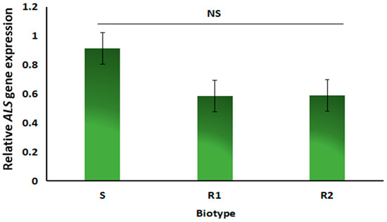The ALS gene expression study using qRT-PCR revealed no difference in the ALS gene expression between the R biotypes and the S biotype (Figure 4). Therefore, our results indicated that ALS gene mutations and overexpression might not have contributed to resistance against pyroxsulam in the A. spica-venti population.