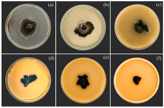 The size and appearance of the fungal colonies were affected by the IR stimulus, with the rates increased from 1 to 15 mL/L (Figure 1a–f). The EC50 obtained for the IR stimulus was 6.4 mL/L (Figure 1g). In comparison to the control treatment (Figure 2a), the germinated conidia of B. maydis had thin and shorter germ tubes when exposed to IR stimulus rates ranging from 1 to 15 mL/L (Figure 2b–f). The conidium germination significantly decreased by 6, 9, 18, 31, and 46% for 1, 2.5, 5, 10, and 15 mL of IR stimulus/L, respectively, compared to the control treatment (Figure S1).