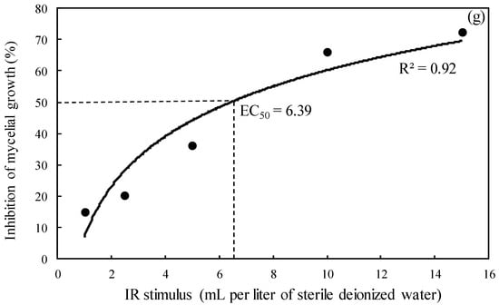Mycelial growth of Bipolaris maydis in Petri dishes containing potato dextrose agar amended with 0 (a), 1 (b), 2.5 (c), 5 (d), 10 (e), and 15 (f) mL of induced resistance (IR) stimulus per liter of sterile deionized water. Effective concentration (EC50) of IR stimulus that inhibited 50% of the mycelial growth from B. maydis (g).