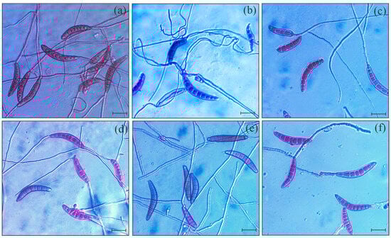 Visual aspect of the germination of conidia from Bipolaris maydis) previously exposed to 0 (a), 1 (b), 2.5 (c), 5 (d), 10 (e), and 15 (f) mL of induced resistance (IR) stimulus per liter of sterile deionized water. Bars = 10 µm.