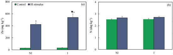 Foliar concentrations of zinc (Zn) (a) and nitrogen (N) (b) for maize plants non-inoculated or inoculated with Bipolaris maydis and sprayed with water (control) or with induced resistance (IR) stimulus. Means for NI and I treatments followed by an inverted triangle (▼) and for control and IR stimulus treatments followed by an asterisk (*) are significantly different according to the F test (p ≤ 0.05). Bars represent the standard error of the means.