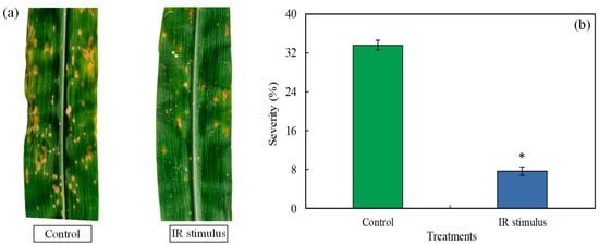 Many necrotic and elliptical lesions developed in the leaves of the maize plants from the control treatment, while the lesions that formed in the leaves of the IR-stimulus-sprayed plants were of reduced size and less in number (Figure 4a). The MLB severity was significantly reduced by 76% for the IR-stimulus-sprayed plants compared to the plants from the control treatment (Figure 4b).
