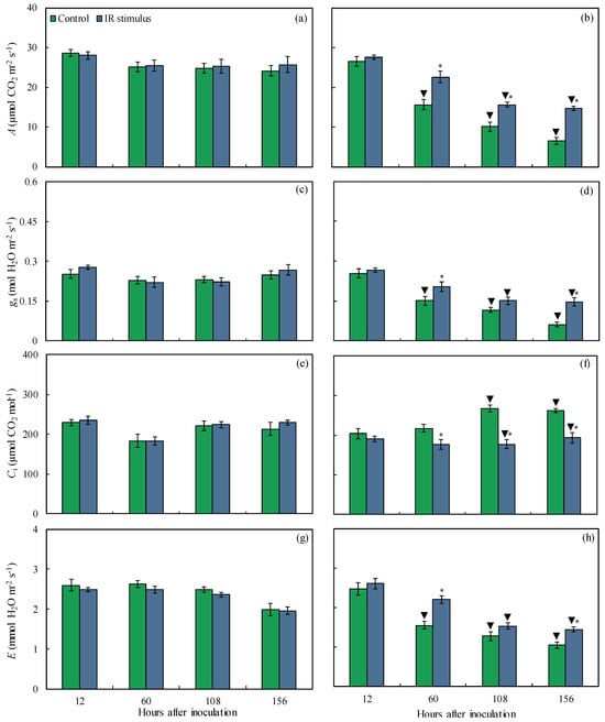 For the non-inoculated plants, the A, gs, Ci, and E values were not affected by the IR stimulus compared to the control treatment, regardless of the evaluation time (Figure 5a,c,e,g). For the inoculated and IR-stimulus-sprayed plants, the A (31, 35, and 56% at 60, 108, and 156 hai, respectively), gs (26 and 57% at 60 and 156 hai, respectively), and E (30 and 27% at 60 and 156 hai, respectively) values were significantly higher while the Ci value (19, 34, and 26% at 60, 108, and 156 hai, respectively) was significantly lower compared to the inoculated and water-sprayed plants (Figure 5b,d,f,h). For the control treatment, the A (38–73% from 60 to 156 hai), gs (34–75% from 60 to 156 hai), and E (41–48% from 60 to 156 hai) values were significantly lower while the Ci value (17 and 19% at 108 and 156 hai, respectively) was significantly higher for the inoculated compared to non-inoculated plants (Figure 5a–h and Figure 5e,f). The A (38 and 43%), gs (32 and 46%), Ci (21 and 16%), and E (35 and 25%) values were significantly lower at 108 and 156 hai for the inoculated and IR-stimulus-sprayed plants compared to their non-inoculated counterparts (Figure 5a–h).