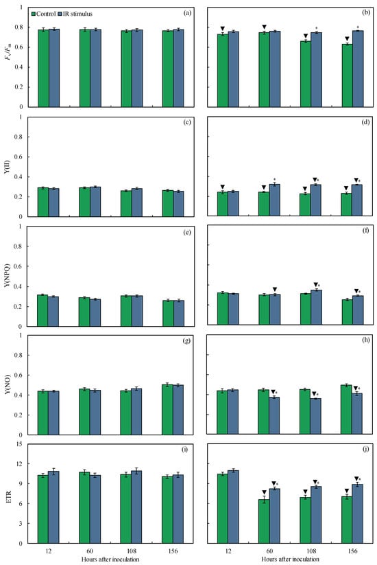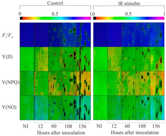 Damage to the photosynthetic apparatus was noticed in the leaves of the inoculated plants from the control treatment compared to the leaves of the inoculated and IR-stimulus-sprayed plants based on the darker areas in the images for the Fv/Fm, Y(II), Y(NPQ), and Y(NO) parameters (Figure 6). For the non-inoculated plants, there was no significant difference between the control and IR stimulus treatments, regardless of the evaluation time (Figure 7a,c,e,g). For the inoculated plants, the Fv/Fm (12 and 18% at 108 and 156 hai, respectively), Y(II) (24, 29, and 27% at 60, 108, and 156 hai, respectively), Y(NPQ) (11 and 14% at 108 and 156 hai, respectively), and ETR (20, 19, and 21% at 60, 108 and 156 hai, respectively) parameters were significantly higher, while the Y(NO) value (16–21% from 60 to 156 hai) was significantly lower for the IR-stimulus-sprayed plants compared to the plants from the control treatment (Figure 7b,d,f,h,j). For the control treatment, the Fv/Fm (6–18% from 12 to 156 hai), Y(II) (13–17% from 12 to 156 hai), and ETR (30–38% from 60 to 156 hai) values were significantly lower for inoculated compared to the non-inoculated plants (Figure 7a–d,i,j). For the IR stimulus treatment, the Y(II) (11 and 20% at 108 and 156 hai, respectively) and Y(NPQ) (11–13% from 60–156 hai) values were significantly higher while the Y(NO) and ETR values were significantly lower for the inoculated plants compared to the non-inoculated plants from 60 to 156 hai (Figure 7c–j).