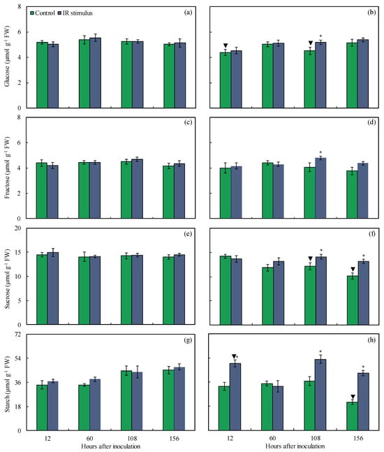 For the non-inoculated plants, there was no significant difference between the control and IR stimulus treatments, regardless of the evaluation time (Figure 9a,c,e,g). For the inoculated and IR-stimulus-sprayed plants, the glucose (13% at 108 hai), fructose (15% at 108 hai), sucrose (14 and 22% at 108 and 156 hai, respectively), and starch (34, 31, and 51% at 12, 60, 156 hai, respectively) concentrations were significantly higher compared to the inoculated plants from the control treatment (Figure 9b,d,f,h). For the control treatment, the concentrations of glucose (17 and 14% at 12 and 108 hai, respectively), sucrose (15 and 27% at 108 and 156 hai, respectively), and starch (52% at 156 hai) were significantly lower for the inoculated compared to non-inoculated plants (Figure 9a,b,e–h). For the IR stimulus treatment, the concentration of starch significantly increased by 26% for the inoculated compared to non-inoculated plants at 12 hai (Figure 9g,h).