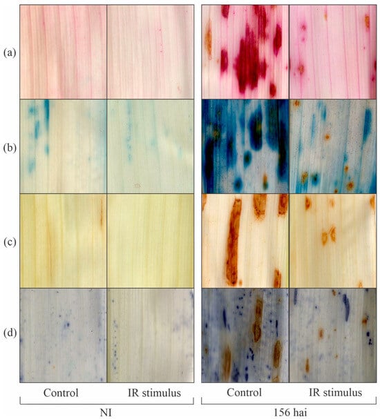 No sign of cellular perturbation on the leaves from the non-inoculated and IR-stimulus-sprayed plants was noticed based on the absence of staining for lipid peroxidation, membrane damage, and depositions of H2O2 and O2•− compared to the leaves of the non-inoculated plants from the control treatment (Figure 10a–d). The lipid peroxidation (pink color), membrane damage (blue color), and depositions of H2O2 and O2•− (brown and blue colors, respectively) were less intense in the leaves of the inoculated and IR-stimulus-sprayed plants than on the leaves of the inoculated plants from the control treatment at 156 hai (Figure 10a–d).