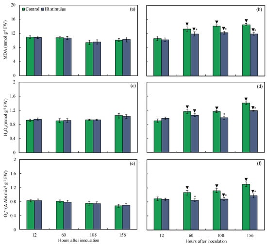 The concentrations of MDA, H2O2, and O2•− for the non-inoculated plants were not affected by the IR stimulus compared to the control treatment, regardless of the evaluation time (Figure 11a,c,e). For the inoculated plants, the MDA (10–18% from 60 to 156 hai), H2O2 (15 and 16% at 108 and 156 hai, respectively), and O2•− (20–25% from 60 to 156 hai) concentrations were significantly lower for the IR-stimulus-sprayed plants compared to the plants from the control treatment (Figure 11b,d,f). For the control treatment, the MDA (19–34%), H2O2 (20–26%), and O2•− (24–48%) concentrations were significantly higher for the inoculated plants compared to the non-inoculated plants from 60 to 156 hai. For the IR stimulus treatment, the MDA (10, 22, and 14% at 60, 108, and 156 hai, respectively), H2O2 (14 and 15% at 60 and 156 hai, respectively), and O2•− (16 and 28% at 108 and 156 hai, respectively) concentrations were significantly higher for the inoculated compared to the non-inoculated plants (Figure 11a–f).
