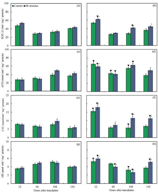 For the non-inoculated plants, there was no significant difference between the control and IR stimulus treatments, regardless of the evaluation time (Figure 12a,c,e,g). For the inoculated plants, the SOD (14, 11, and 19% at 12, 108, and 156 hai, respectively), APX (33% at 156 hai), CAT (14, 50, and 41% at 12, 108, and 156 hai, respectively), and GR (12 and 27% at 12 and 156 hai, respectively) activities were significantly higher for the IR-stimulus-sprayed plants compared to the plants from the control treatment (Figure 12b,d,f,h). The activities of APX (10% at 12 hai) and GR (16 and 18% at 60 and 108 hai, respectively) were significantly lower for the inoculated and IR-stimulus-sprayed plants compared to the inoculated plants from the control treatment (Figure 12d,h). For the control treatment, the activities of APX (58, 27, and 29% at 12, 60, and 108 hai, respectively), as well as those of CAT and GR (49 and 33% at 12 hai, respectively), were significantly higher for the inoculated compared to the non-inoculated plants (Figure 12c–h). For the IR stimulus treatment, the SOD (14% at 12 hai), APX (53, 29, and 21% at 12, 60, and 108 hai, respectively), CAT (49, 16, and 46% at 12, 108, and 156 hai, respectively), and GR (36 and 21% at 12 and 156 hai, respectively) activities were significantly higher for the inoculated compared to the non-inoculated plants (Figure 12a–h).