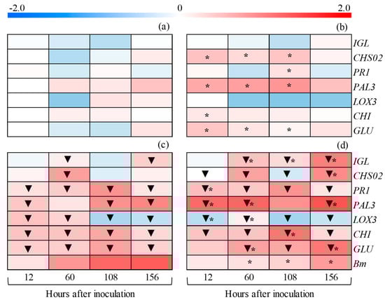 Expression profile of genes determined on leaves of maize plants that were non-inoculated (NI) (a,b) or inoculated (I) (c,d) with Bipolaris maydis and sprayed with water (control) (a,c) or with induced resistance (IR) stimulus (b,d). Color cells represent the relative transcript levels ranging from blue (−2.0) to red (2.0). The amplification of cytosolic glyceraldehyde-3-phosphate dehydrogenase (GAPDH) from maize was used as an internal control for data normalization. Fold changes for each gene expression were calculated based on the transcript level obtained for leaves from NI plants of control treatment at 12 h after inoculation (hai), except for the Bm gene from B. maydis. For Bm, the transcript level obtained for leaves from I plants of control treatment at 12 hai was used in the calculation. For each leaf sample, four biological replications were used with three technical replicates each. Means for NI and I treatments (comparisons between (a,c) and (b,d)) followed by an inverted triangle (▼) and for control and IR stimulus treatments (comparisons between (a,b) and (c,d)) followed by an asterisk (*), at each evaluation time, are significantly different (p ≤ 0.05) according to the F test.
