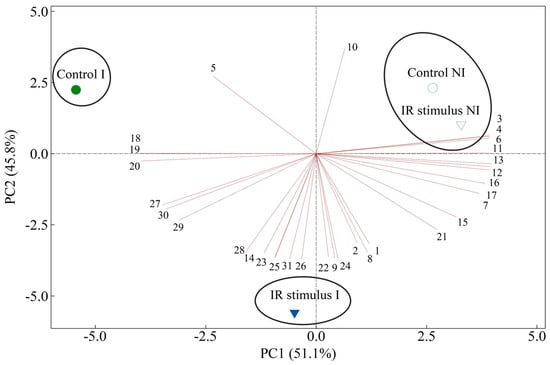 According to the cluster analysis with complete linkage and a Pearson distance, three clusters were generated: inoculated plants from the control treatment, inoculated plants from the IR stimulus treatment, and non-inoculated plants from the control and IR stimulus treatments (Figure 14). One principal component (PC) explained most of data variation (PC1 = 51.1% and PC2 = 45.8%) (Figure 14). PC1 indicated negative scores for Ci, glucose, MDA, H2O2, O2●−, CAT, IGL, CHS02, PR1, PAL3, LOX3, CHI, and GLU, while positive scores were obtained for Zn, N, A, gs, E, Fv/Fm, Y(II), Y(NPQ), Y(NO), ETR, Chl a+b, carotenoids, fructose, sucrose, starch, SOD, APX, and GR. PC2 was characterized by negative scores for Zn, N, Fv/Fm, Y(II), Y(NPQ), Chl a+b, carotenoids, glucose, fructose, sucrose, starch, O2●−, SOD, AOX, CAT, GR, IGL, CHS02, PR1, PAL3, LOX3, CHI, and GLU, while positive scores were obtained for A, gs, Ci, E, Y(NO), ETR, MDA, and H2O2 (Figure 14).