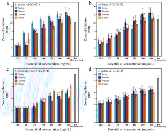 | Season | S. aureus (mg/mL) | M. luteus | L. monocytogenes (mg/mL) | P. putida (mg/mL) | |