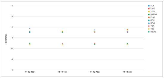 Expression of housekeeping genes at 1 and 7 dpi. T1–T2: cultivar Santina cherry trees inoculated with Pseudomonas syringae pv. syringae 11116B1 vs. mock-inoculated; T3–T4: cultivar Bing cherry trees inoculated with P. syringae pv. syringae 11116B1 vs. mock-inoculated. *FDR < 0.05 and |FC| > 2. ACT: actin 2/7; CYP2: cyclophilin; TEF2: translation elongation factor 2; GAPDH: glyceraldehyde-3-phosphate dehydrogenase; PLA2: phospholipase A2 beta; RP II: RNA polymerase subunit; RPLI3: 60S ribosomal protein L I 3; TUA: tubulin alpha-5; TUB: tubulin beta-1; UBQ10: ubiquitin 10.