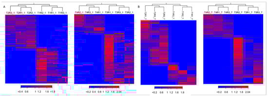 Clustered heat map of DEGs: (A) 1 dpi; (B) 7 dpi. T1: cultivar Santina cherry trees inoculated with Pseudomonas syringae pv. syringae 11116B1; T2: mock-inoculated cultivar Santina cherry trees; T3: cultivar Bing cherry trees inoculated with P. syringae pv. syringae 11116B1; T4: mock-inoculated cultivar Bing cherry trees.