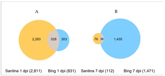 Venn diagrams showing differentially expressed sweet cherry genes post-inoculation with Pseudomonas syringae pv. syringae 11116B1 in cultivars Santina and Bing: (A) 1 dpi; (B) 7 dpi.