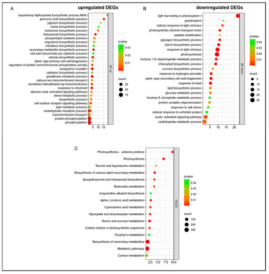 Gene Ontology enrichment of DEGs in response to Pseudomonas syringae pv. syringae inoculation in cultivar Santina at 1 dpi: (A) biological process, upregulated DEGs; (B) biological process, downregulated DEGs; (C) KEGG pathways. BP: biological process. Y axis: GO pathways; X axis: enrichment factors.