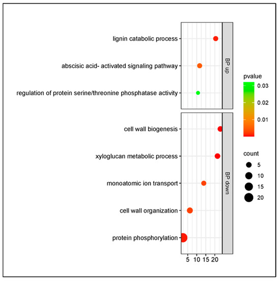The samples from cultivar Bing revealed a smaller number of biological processes than those from cultivar Santina at 1 dpi. The upregulated genes were significantly enriched in the lignin catabolic process and abscisic acid-activated signaling pathway; the downregulated DEGs were enriched in cell wall biogenesis and xyloglucan metabolic process (Figure 6). In the xyloglucan metabolic process, the DEGs were downregulated, in conjunction with the downregulation of the enzyme xyloglucan endotransglucosylase/hydrolase (XTHs) and the upregulation of lignin catabolic genes, suggesting an effect on the strength of the cell wall. In cultivar Santina, this process was upregulated and the DEGs of secondary cell wall biogenesis were downregulated.