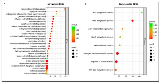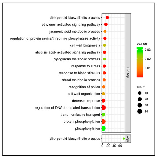Analyzing the upregulated genes in the cultivar Bing at 7 dpi, the biological categories overrepresented the terpene biosynthetic process, dipeptide transport, response to stress, cell surface receptor signaling pathway, hydrogen peroxide catabolic process, response to oxidative stress, and defense response involved in plant immune response. Also, genes related to plant hormone biosynthesis showed enrichment: jasmonic and salicylic acid metabolic processes, ethylene and auxin-activated signaling pathways, and brassinosteroid homeostasis; and cell wall biogenesis and organization (Figure 8A). The downregulated genes were enriched in wax and cutin biosynthetic processes (Figure 8B).