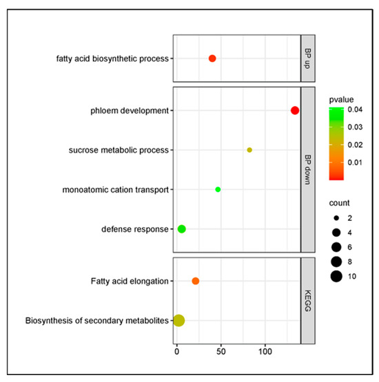 In the cultivar Santina, the response upon P. syringae pv. syringae inoculation was observed to decrease, although it kept active the metabolic pathway of biosynthesis of secondary metabolites and showed enriched phloem development and fatty acid biosynthesis, presenting down- and upregulated genes, respectively (Figure 9).