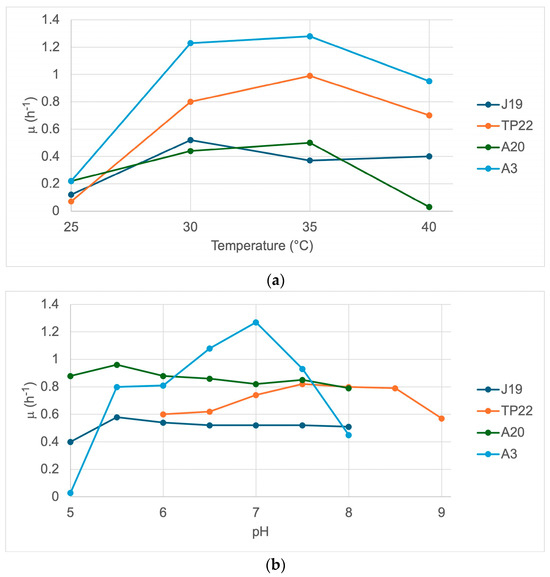 Three parameters (temperature, pH, and agitation) were independently modified to optimize the bacterial growth of strains J19, TP22, A20, and A3 (Figure 1). For this purpose, the microbial growth rate (μ) was determined from each bacterium’s exponential growth phase under each condition. The highest μ value is indicative of the optimum condition.