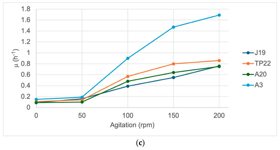 Determination of the optimal conditions for the growth of the strains J19, TP22, A20, and A3. The microbial growth rates were determined as µ (h−1): (a) temperature optimization; (b) pH optimization; and (c) agitation optimization.
