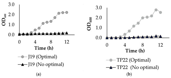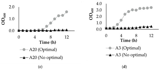 Bacterial growth curves were determined using the OD600 under optimal and non-optimal conditions (Figure 2). Under optimal conditions, the strain J19 exhibited an increase in growth (exponential phase) after 4 h of incubation, reaching its stationary phase after 10 h of post-inoculation (30 °C, 200 rpm, and pH 5.5). For strain TP22, the exponential phase began after 4 h of incubation, with the stationary phase reaching 11 h under optimal conditions (35 °C, 200 rpm, and pH 7.5). The strain A20, under optimal conditions (35 °C, 200 rpm, and pH 5.5), entered the exponential phase after 7 h of incubation, reaching the stationary phase after 12 h. The strain A3 reached the exponential phase at 3 h and the stationary phase at 9 h under optimal conditions of 35 °C, 200 rpm, and pH 7.0. However, in non-optimized conditions, the growth curves of the strains showed a lag phase between 0 and 12 h.