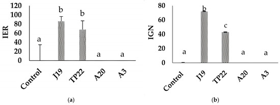 Regarding bacteria’s in vitro biocontrol activity against the weed C. echinatus, strain J19 inhibited germination by 72% and root elongation by 86%. In comparison, strain TP22 inhibited germination by 43% and root elongation by 68% in C. echinatus (Figure 3). It has been reported that the bacterium P. aeruginosa strain A52 exhibits strong herbicidal potential, inhibiting the growth of weeds such as Axonopus affinis and Lens esculenta by 75% and 50%, respectively [34]. Additionally, P. aeruginosa completely inhibited germination, root growth, and shoot development in dicotyledonous weed seeds, with invasive weeds showing higher sensitivity and lower effectiveness observed in monocotyledonous weeds; the seeds that managed to germinate displayed stunted growth due to the presence of quinoline and exposure to high levels of HCN [35,36]. Regarding phytotoxic effects, strain J19 demonstrated high toxicity in the germination index (IGN), while strain TP22 exhibited moderate toxicity. Root elongation is considered more critical than germination due to its physiological processes, as toxic substances can disrupt normal plant development. However, these volatile-producing bacteria do not necessarily eradicate weeds but could suppress initial weed growth, thereby facilitating the development of cultivated plants impacted by weeds [36].