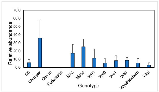 Relative abundance of MBOA in root rhizoplane of wheat cultivars grown in field plots at mid-tillering in 2020. Values are relative abundance adjusted for weight of root samples (+standard error).