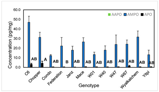 Abundance of aminophenoxazinones in root rhizoplane of wheat cultivars grown in field plots on 1 July 2020 (early tillering). Values are mean concentration per mg of root tissue (+standard error). Letters adjacent to bars indicate significant differences in abundance of APO (bars accompanied by the same letter are not statistically different as determined by Tukey’s honestly significant difference). Bars for AAPO and AMPO have no accompanying letters because levels of these metabolites did not differ among genotypes, and AAPO ws not detected.