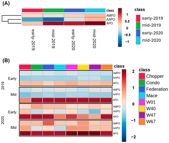 Heat maps showing differential abundance of aminophenoxazinones in the rhizosphere among genotypes and growth stage for wheat genotypes common to both years of the study. Levels of abundance, from high to low, are coloured from dark red to dark blue. (A) Relative abundance of the three aminophenoxazinones averaged over all genotypes for the two stages of plant growth (early and mid-tillering) and year (2019 and 2020). (B) Relative abundance of aminophenoxazinones at early and mid-tillering across eight genotypes common to both years of the study. Data for both heat maps were log10-transformed.