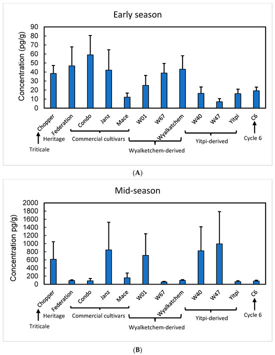 In 2020, the experimental treatments further included cv. Wyalkatchem, from which W01 and W67 were derived, and Yitpi, the commercial parent line from which W40 and W47 were derived. Additionally, an experimental accession derived from sixth cycle of the recurrent selection for shoot vigour (C6) was included owing to its early vigour and high biomass. Compared to the parental wheat cultivars, most of the samples from experimental cultivars showed similar abundance of total aminophenoxazinones at early tillering (Figure 5A). By mid-tillering, however, the experimental lines with the exception of W67 had accumulated substantially higher levels of total aminophenoxazinones in the rhizosphere than the parental material (Wyalkatchem and Yitpi) (Figure 5). Total aminophenoxazinones were significantly higher at midseason compared to early season in both 2019 (F1,95 = 84.1, p < 0.0001, and 2020 (F1,95 = 57.4, p < 0.0001), although there were no statistical differences between genotypes because of large genotype-to-genotype variability.