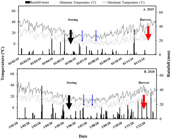 Seasonal rainfall (black bars) and maximum and minimum temperatures (grey lines) at the Wagga Wagga site for 2019 (A) and 2020 (B). Arrows denote the sowing (black arrows) and the harvest (red arrows) of winter crops. Sampling events are indicated by blue arrows in both years.