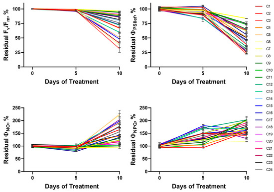 All tested cultivars were divided into the four groups described above according to the dynamics of changes in ΦPSII, which is one of the key ChlF parameters reflecting the activity of photosynthetic processes: the NT group included cultivars C1, C3, C5, C12, C13, C14, C15, C16, C18, C23, and C24; MT—C2, C4, and C6; HT—C8, C19, C20, and C21; HHT—C7, C9, C10, C11, C17, and C22. The average dynamics of residual ΦPSII for each group were obtained by summarizing data from the respective cultivars (Figure 4). The analysis of the obtained dynamics showed good agreement with the characterized patterns of drought-induced changes, including their qualitative and quantitative characteristics.