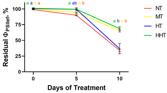 Drought-induced dynamics of residual ΦPSII level of four groups of cultivars classified according to the patterns of changes in photosynthetic activity during drought development. Data are presented as mean ± SEM. NT—group with low photosynthetic tolerance, MT—group with high photosynthetic tolerance to the short-term moderate DS but not tolerant to long-term intensive DS, HT—group showing reduced photosynthetic activity under short-term moderate DS and high photosynthetic tolerance to the long-term intensive DS, HHT—group with high photosynthetic tolerance to both short-term and longer-term DS. Significant differences between the groups are indicated by different letters (ANOVA followed by Tukey’s test, p < 0.05).