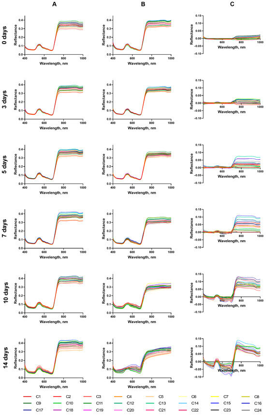 Reflectance spectra of shoots before the start of the drought and 3, 5, 7, 10, and 14 days after the cessation of irrigation (at the ages of 14, 17, 19, 21, 24, and 28 days, respectively) were obtained by analyzing hyperspectral images of CC (Figure 5A) and DS plants (Figure 5B).