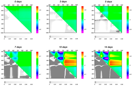 Heat maps of NDI differences between CC and DS plants (∆NDIs) at different days of drought. Data are presented as mean ∆NDIs (top right) and p-values (bottom left).