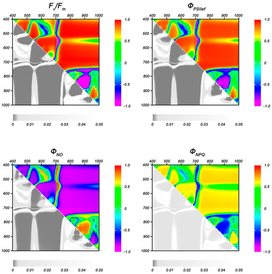 With the increase in the duration of drought stress, the regions with statistically significant correlation expanded and covered a major part of the heat maps; the distribution patterns of these regions and their boundaries were close for all ChlF parameters (Figure 8). On the other hand, one of the regions showing a fairly high correlation with the residual values of ChlF parameters on the fifth day of DS (λ1 580–640, λ2 440–500 nm) partially lost significant relationship by the 10th day; the highest correlation coefficients were observed in the ranges λ1 585–610, λ2 440–460 nm and λ1 610–630, λ2 460–490 nm (−0.70, 0.60, and −0.75 for Fv/Fm, ΦPSII, and ΦNPQ, respectively). There was no statistically significant correlation with the residual levels of ΦNPQ in this range.