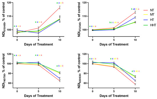 At the next step, we analyzed the dynamics of NDI values of DS plants normalized to control values within the groups assigned according to the patterns of changes in photosynthetic activity (Figure 9). Analysis of the dynamics of changes in these NDIs showed that the greatest correspondence with the changes in current photosynthetic activity, estimated by the dynamics of the residual ΦPSII level, was revealed for NDI572/545; there was a clear separation between groups, similar to that for residual ΦPSII. For the majority of indices, multiple comparisons of quantitative characteristics of different groups showed less clear separation than for ΦPSII. NDI610/450 performed worse than other analyzed indices: the MT, HT, and HHT groups did not differ significantly from each other either at the fifth or at the 10th day of DS. At the same time, the patterns of changes of the other NDIs (NDI572/545, NDI740/700, and NDI820/630) during drought development correspond well to those for ΦPSII.